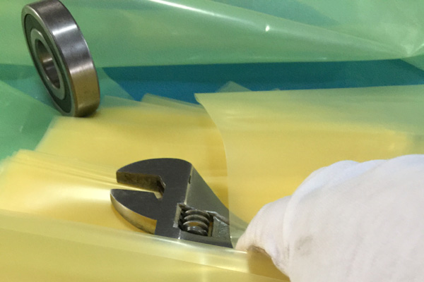 VCI氣相防銹膜(防銹袋)是將高分子聚乙烯樹(shù)脂(LDPE)與功能VCI樹(shù)脂配比混合,采用現(xiàn)代薄膜共擠技術(shù)生產(chǎn)的新一代復(fù)合防銹薄膜。具有良好的氣化防銹性能、阻隔防潮、使用方便、透明直觀(guān)等特點(diǎn);當(dāng)用塑料袋包裹金屬產(chǎn)品時(shí),氣相緩蝕劑在封閉空間內(nèi)氣化并凝聚在所有金屬表面上形成氣相保護(hù)層,從而防止金屬產(chǎn)品銹蝕。符合GB-T19532-2004防銹性能要求。